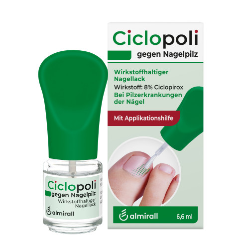 Ciclopoli® gegen Nagelpilz ist ein medizinischer Nagellack mit dem bewährten Wirkstoff Ciclopirox. Durch die besondere Lacktechnologie wird der Wirkstoff Ciclopirox bis in die Tiefe des Nagels transportiert. Dort kann er seine starke Wirkung gegen  Nagelpilz voll entfalten. Lästiges Feilen und Nagellackentferner sind überflüssig: der Anti-Pilz-Lack ist wasserlöslich.