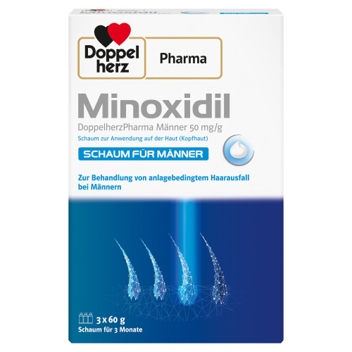Wirkstoff: Minoxidil. Zusammensetz.: 1g Schaum enth. 50 mg Minoxidil (5 % w/w). Anwendungsgebiete: Das Arzneim. bewirkt ein Nachwachsen d. Haare und stabilisiert d. Verlauf des Haarausfalls bei zurückweichendem Haaransatz u. im Tonsurbereich der Kopfhaut bei Männern durch Revitalisierung d. Haarfollikel. Zur Behandlung von erwachs. Männern ab 18 Jahren mit anlagebedingtem Haarausfall (androgenetische Alopezie). Warnhinweise: Enth. 560 mg Alkohol (Ethanol) in jed. Dosis (1 g), entspr. 560 mg Alkohol/g Arzneimittel (56 % w/w), Butylhydroxytoluol, Cetylalkohol, Stearylalkohol.