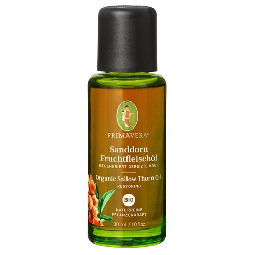 Das Sanddornfruchtfleischöl bio wirkt intensiv regenerierend bei gereizter Haut. In der Aromapflege hat es sich sehr bewährt zur Pflege der Mundschleimhaut. Der Rohstoff für das wertvolle Öl sind Sanddornbeeren aus kontrolliert-biologischem Anbau in Deutschland. Das kaltgepresste, naturbelassene Öl wird aus dem Fruchtfleisch der Sanddornbeeren gepresst. Dadurch ist eine natürliche Trübung möglich und ein Zeichen von Naturbelassenheit. Das Öl ist in geringer Dosierung sehr wirksam und färbt stark, dadurch wird es selten pur, sondern vor allem tropfenweise gemischt mit Pflegeölen eingesetzt.